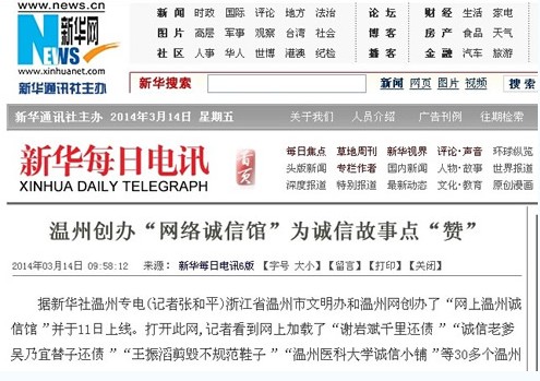 浙江省温州市文明办和温州网创办了“网上温州诚信馆”并于11日上线。