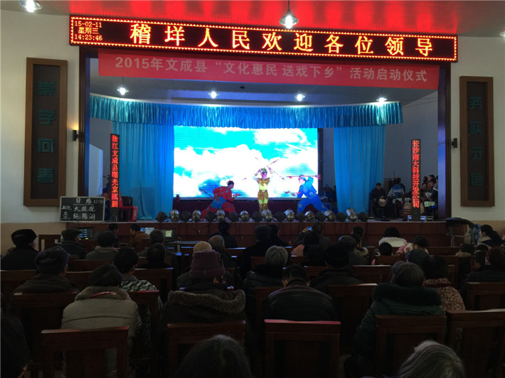 2月11日中午,文成县2015年“文化惠民送戏下乡”活动启动仪式在新建成的黄坦镇稽垟村文化礼堂举行,千余名观众一起观赏了由文成县曙光京瓯剧团带来的精彩剧目《纯阳洞》,为即将来临的新春佳节增添了祥和喜乐的气氛。