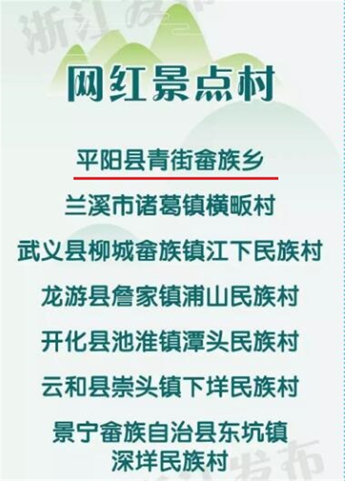 6月12日,浙江省首届民族乡村振兴“百村大会堂”活动在衢州市龙游县举办。活动现场公布了浙江首批“农文旅”融合开发培育民族村名单,包括民宿特色村、农产品特色村、民俗文创特色村、网红景点村等四类。全省24个民族乡镇、村名列其中,我市5个镇村上榜。其中,文成县西坑畲族镇让川民族村、泰顺县司前畲族镇左溪民族村入选民宿特色村,苍南县莒溪镇、平阳县鳌江镇书阁民族村入选农产品特色村,平阳县青街畲族乡入选网红景点村。